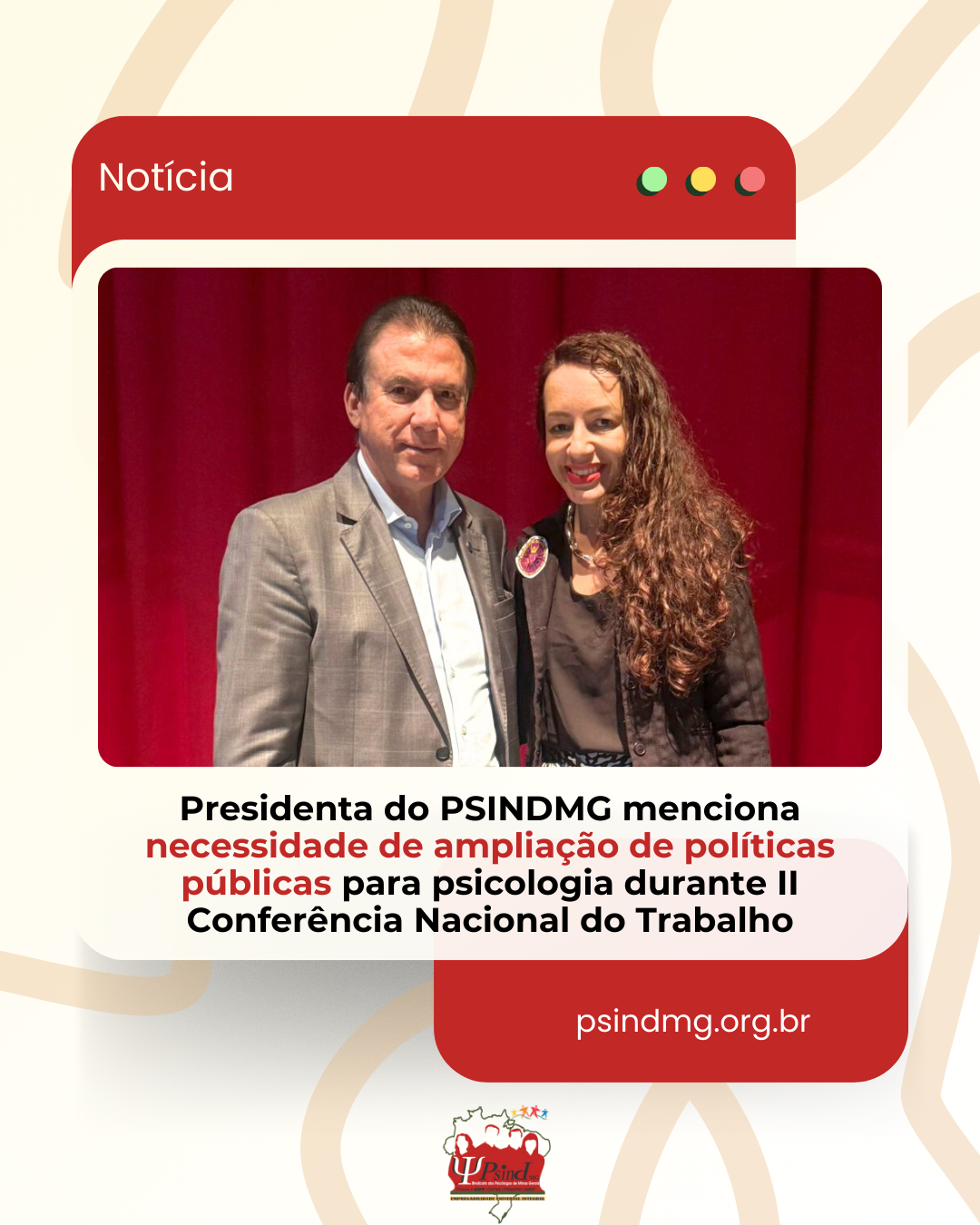 O Sindicato dos Psicólogos do Estado de Minas Gerais (PSINDMG), representado pela sua presidenta Jennifer Souza, compôs às discussões voltadas ao fortalecimento do emprego, da proteção social e ao trabalho decente no Estado.